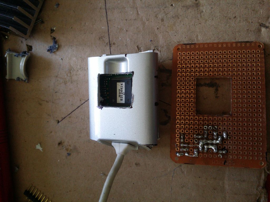 L'adaptation du boitier de la webcam et de la plaque pastillée pour le passage du système de refroidissement nécessite de repérer précisement l'emplacement du microcontroleur (SAA) de la webcam et de découper un carré de 20mm x 20mm.